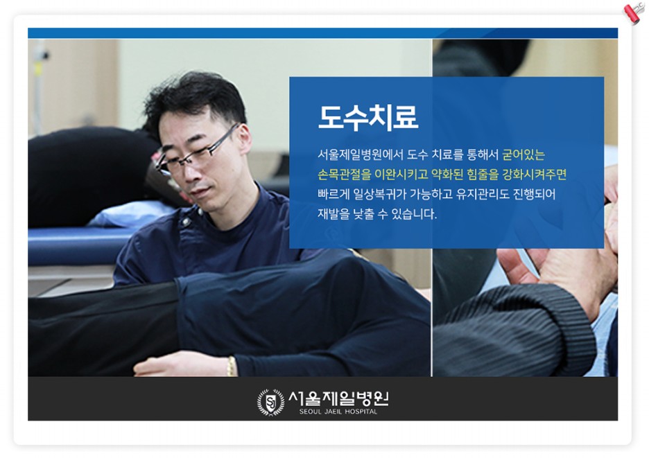 맨손치료는 수술처럼 피부절개나 마취가 필요없이 치료사의 손만을 이용하여 척추와 굳어 있는 관절을 교정하는 치료를 말합니다. 도수치료를 통해 몸의 균형을 바로잡고 문제가 되는 근육과 인대 등의 조직을 강화하여 통증을 개선할 수 있도록 도와줍니다. 그 외에도 다양한 비수술적 치료를 통해 손목터널증후군을 개선할 수 있도록 도와드리고 있으니 많은 부담 없이 내원하세요!!