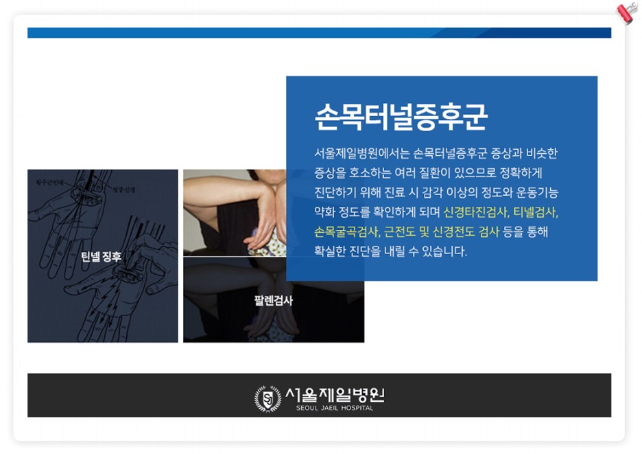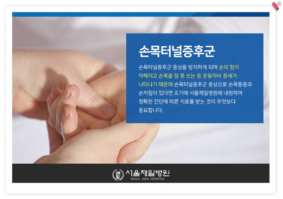 손목터널증후군은 손목 앞쪽에 있는 수근관이라는 작은 통로가 다양한 원인에 의해 좁아지고, 이곳을 통과하고 있는 정중신경이 눌려 손과 손가락의 통증, 저림, 시린 증상, 감각 저하 등의 증상이 나타나는 것입니다. 손목터널증후군은 의학적 명칭으로 수근관증후군이라고 하며, 손목의 사용이 많은 직업군, 가장 주부에게 많이 나타나고 있습니다. 손목터널증후군이 많은 사람들에게서 자주 발생하는 것으로, 손목에 통증을 느낀다면 신속하게 내원하여 손목의 상태를 체크해 보는 것이 좋습니다.