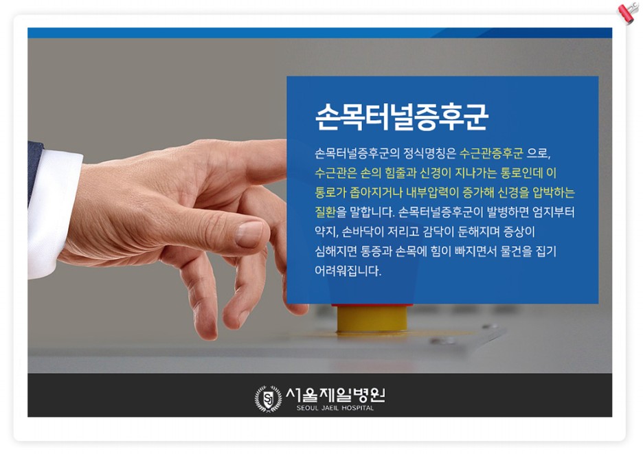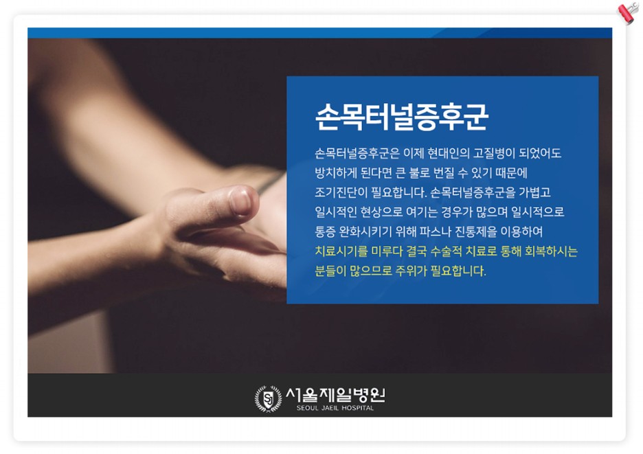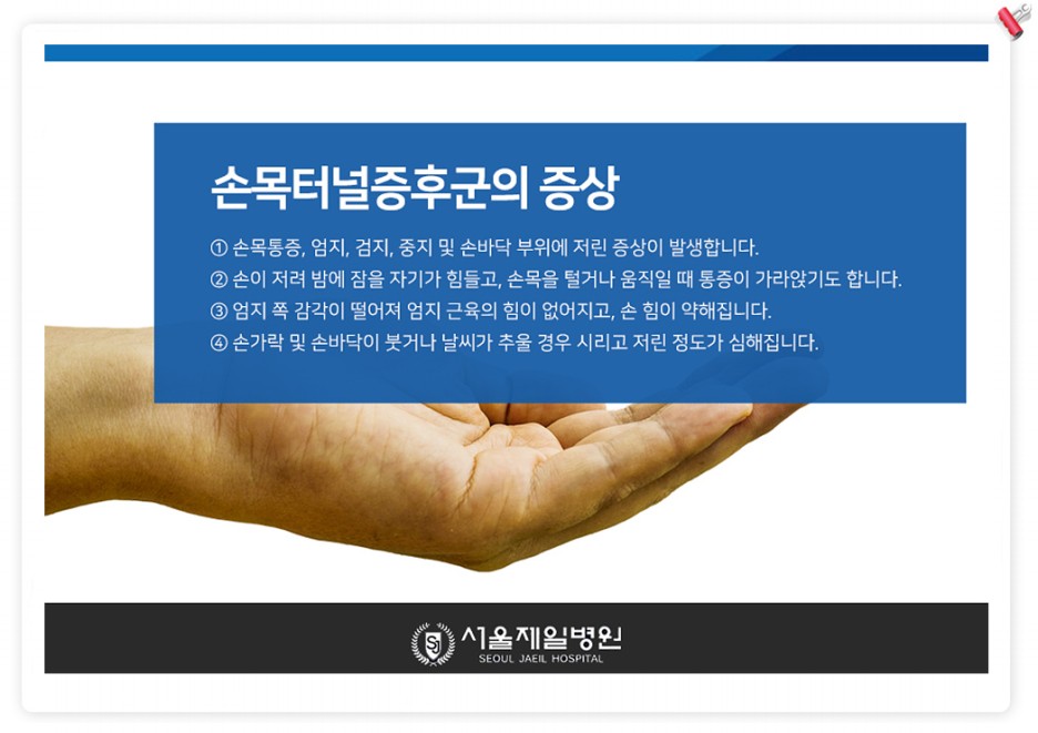 저희는 평소에 손을 써서 하는 게 많아요 스마트폰을 만질 때, 물건을 잡을 때, 젓가락을 사용할 때 등 다양한 부분에서 손목을 많이 사용하는데, 이렇게 사용이 많은 관절은 항상 주의가 필요합니다. 특히 손목 부분에 질환이 발생하여 손을 쓰기 어려운 상황이 발생할 수 있는데 이는 일상생활에 많은 지장을 줄 수 있습니다. 오늘 저희 병원에서는 목부 질환 중 하나인 손목 터널 증후군에 대해 소개하겠습니다.