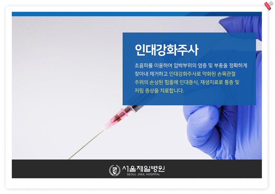 인대강화주사는 손상된 인대와 척추, 관절, 힘줄 등의 염증 및 통증을 유발할 때 처방할 수 있는 비수술적 치료방법입니다. 우리 몸에 해롭지 않은 고농도 포도당이 주성분인 약물을 손상 부위에 주입하여 회복, 강화, 재생 속도를 높이는 치료 방법입니다. 손상이 발생하고 통증이 발생하는 부위에 초음파검사를 통해 정밀하게 파악한 뒤 스스로 자가 치유할 수 있는 증식제 역할을 하는 약물을 투여해 통증의 근본 원인을 규명할 수 있도록 돕고 있습니다.