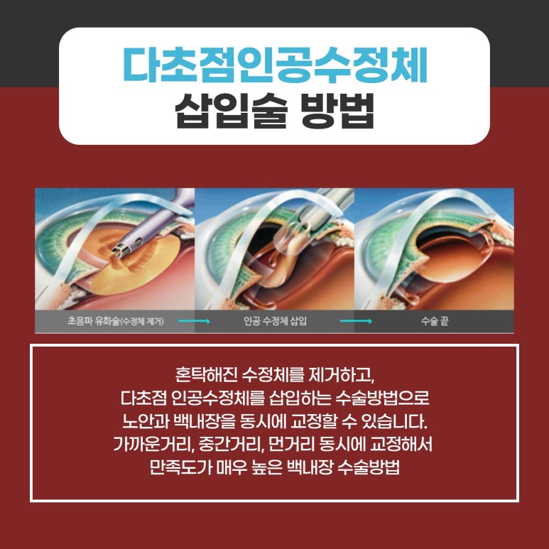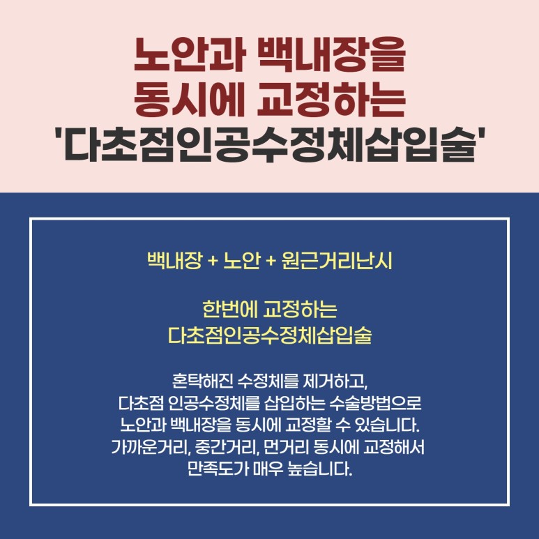 그 중 노안을 비롯한 백내장을 동시에 치료하기 위해서는 부평백내장안과에서는 초점 인공수정체 삽입술을 시행하고 있습니다.