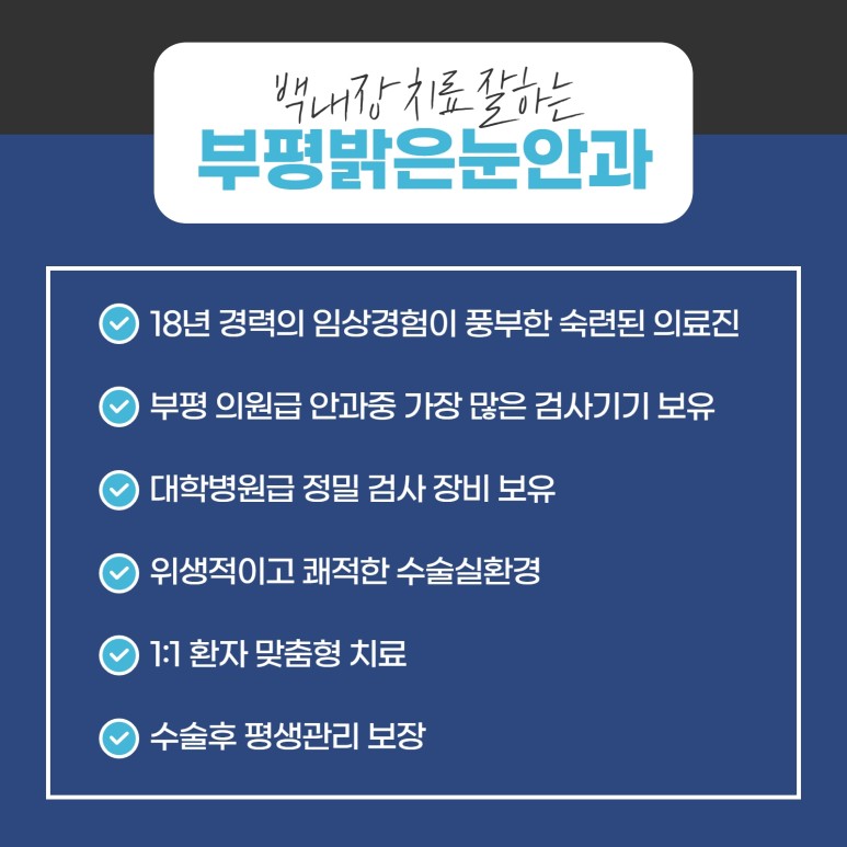 따라서 정확한 눈검사를 바탕으로 18년 이상의 전통에서 수많은 경험과 임상경험, 노하우를 보유하고 있는 부평백내장안과에서 검사와 치료를 서둘러 주시기 바랍니다.