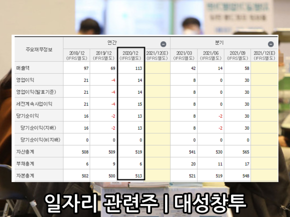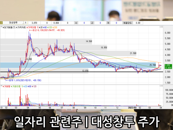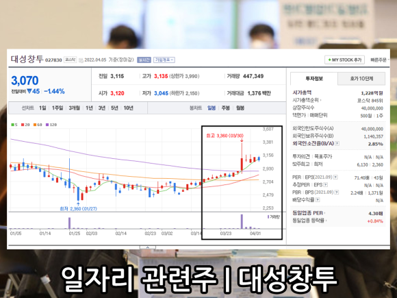 일자리 관련주(청년) 일자리 관련주에 대해서는 지난해 말 언급하면서 크게 부각되지는 않았다. 대체로 종목이 창투사나 온라인 교육 등의 종목이 관련됐다는 것을 참고하자.대성황의 주가