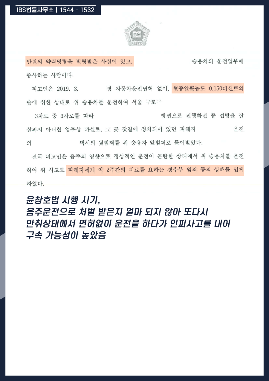 • 현재 진행 중인 자신의 사건이 단시간에 여러 차례 적발될 경우 인피사고나 물피사고까지 발생한 사례, 검출된 혈중알코올농도 수치가 높은 상태, 사고를 내고 도주까지 한 사안이라면 구속되는 심각한 상황임을 인지하고 서둘러 교통범죄사건 전문가로 구성된 IBS 교통전담센터의 도움을 받아야 합니다.