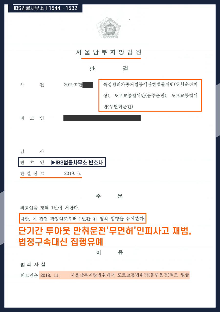• 단기간에 음주운전 2진 아웃, 무면허인 피검사까지 발생 IBS 교통전담센터의 명성을 듣고 찾아온 의뢰자