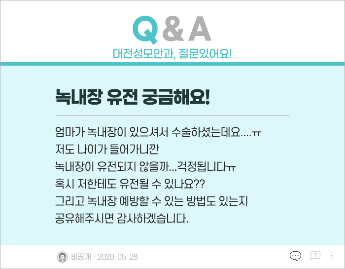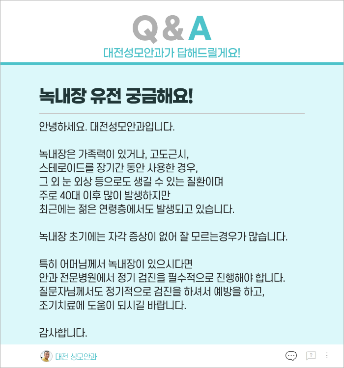 녹내장 유전의 유무와 예방방법에 대해 질문을 주셨습니다!이 부분에 대해 대전성모안과 함께 알아보겠습니다 🙂