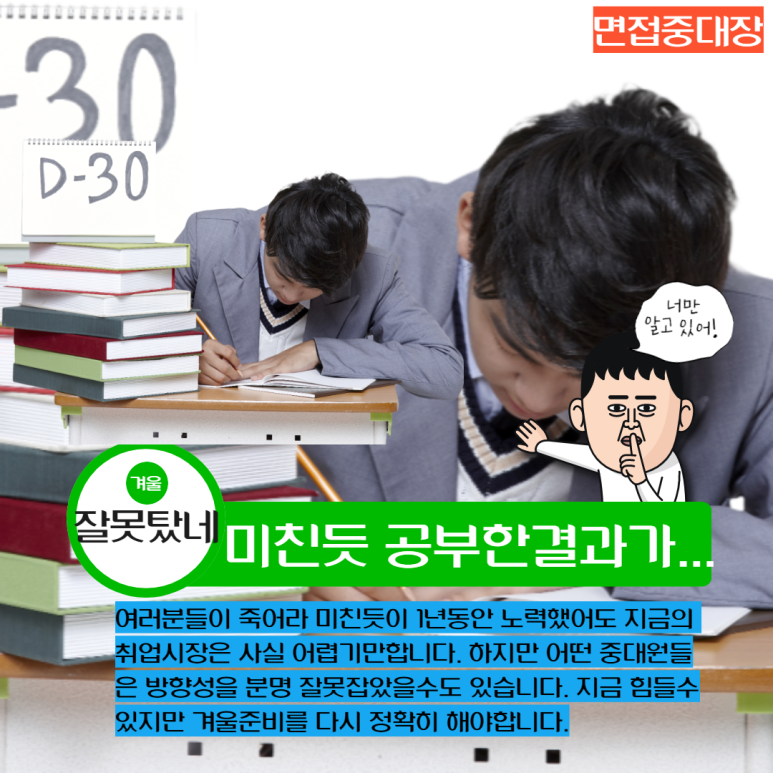 따라서 아래와 같이 첫 취업을 준비하거나 지속적으로 불합격 소식으로 가슴 아픈 취업준비생이 있는 경우에는 반드시 방학기간 동안 준비를 잘 하시고 빠른 성공취업을 하시기 바랍니다.