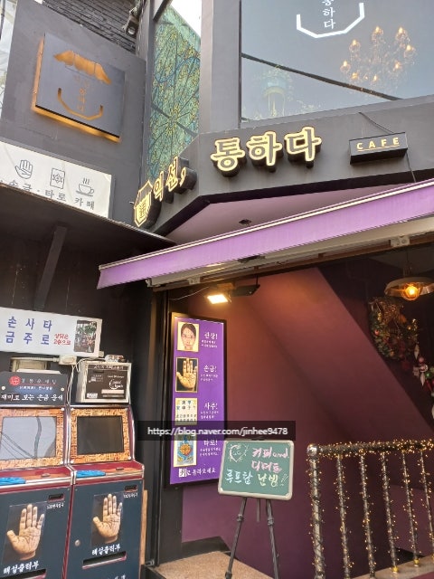 입구와 계단에서부터 보라색이 몽롱하면서 신비로운 분위기로 신점, 점쟁이보다 접근하기 쉬울 것 같다.