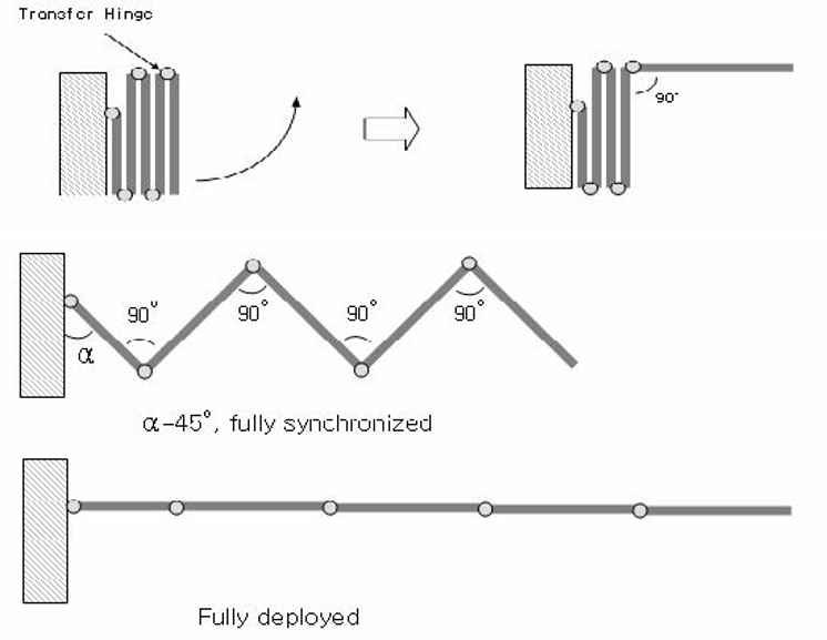동기식 힌지 시스템의 전개 과정을 나타내는 그림. 각 패널이 동일한 각도를 유지하면서 전개된다. <그림 출처= 인공위성 태양전지판의 힌지 메카니즘 및 전개구동에 관한 연구>