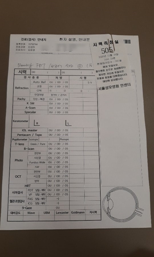 라섹 수술을 한 병원에서 오른쪽 눈이 녹내장 같다는 진단을 받아 성모병원에 정밀검사를 예약했다.