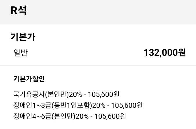 송가인 콘서트 전주 R석가격 – R석 : 132,000원 – 국가유공자(본인만) 20% : 105,600원 – 장애인 1~3급(동반 1인 포함) 20% : 105,600원 – 장애인 4~6급(본인만) 20% : 105,600원