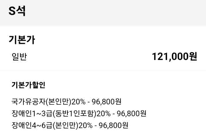 송가인 콘서트 전주 S석가격 – S석 : 121,000원 – 국가유공자(본인만) 20% : 96,800원 – 장애인 1~3급(동반 1인 포함) 20% : 96,800원 – 장애인 4~6급(본인만) 20% : 96,800원