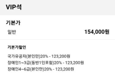 송가인 콘서트 전주 VIP석 가격 – VIP석 : 154,000원 – 국가유공자(본인만) 20% : 123,200원 – 장애인 1~3등급(동반 1인 포함) 20% : 123,200원 – 장애인 4~6급(본인만) 20% : 123,200원