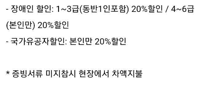 장애인이나 국가유공자는 본인 또는 동반 1인을 포함하여 할인을 받을 수 있습니다. 단, 증빙서류를 반드시 지참하셔야 합니다.