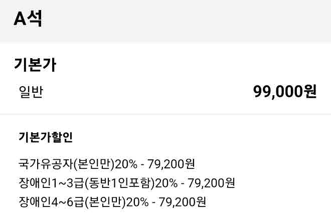 송가인 콘서트 A석 가격 – A석 : 99,000원 – 국가유공자(본인만) 20% : 79,200원 – 장애인 1~3급(동반 1인 포함) 20% : 79,200원 – 장애인 4~6급(본인만) 20% : 79,200원