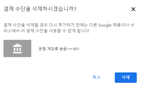 삭제 확인 메시지가 나타납니다.결제수단을삭제하겠습니까?