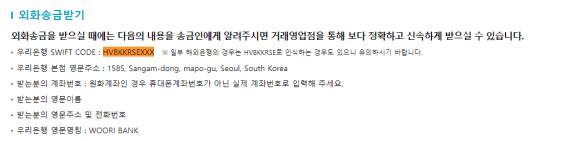 우리은행 SWIFT CODE 구글 해보니 외화송금 받는 우리은행 사이트에 이런 게 있더라고요 BIC 코드는 숫자로만 돼있는 줄 알았는데 우리은행 SWIFT CODE는 HVBKR SEXXX입니다 그래서 이걸 입력해주셨어요그 외에도 HVBKRSE가 될 수도 있대요