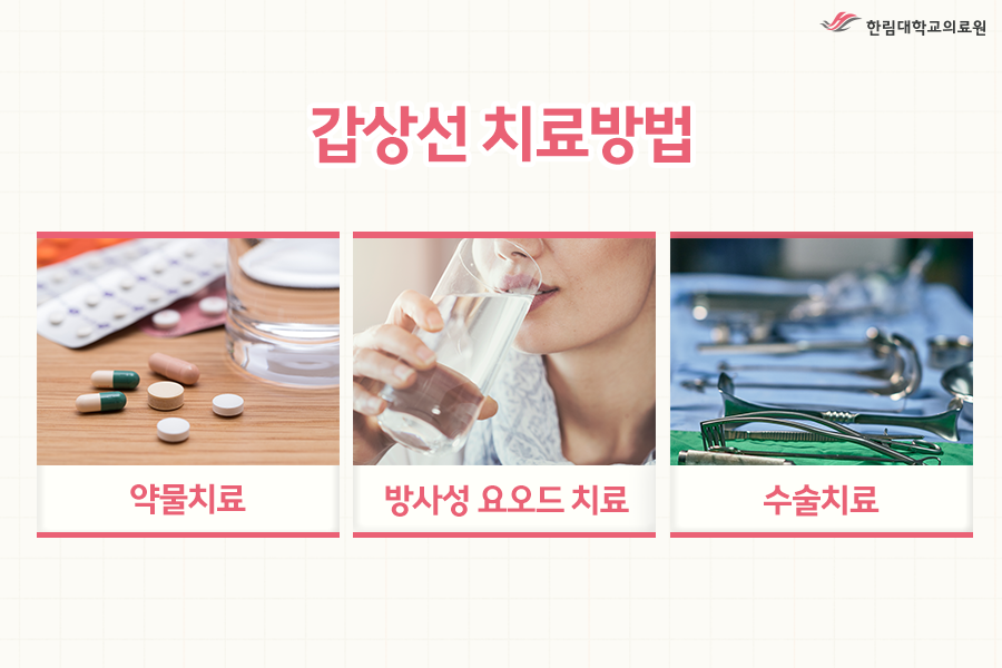 안정적인 항갑상선제 복용만으로 증상을 호전시킬 수 있지만 환자의 복약 순응도가 낮거나 호전되지 않으며 약 부작용 등이 있는 경우에는 갑상선 호르몬 생성을 막는 방사선 요오드 치료나 갑상선 조직을 제거하여 고도의 호르몬 분비를 저하시키는 수술적 치료를 하게 됩니다.