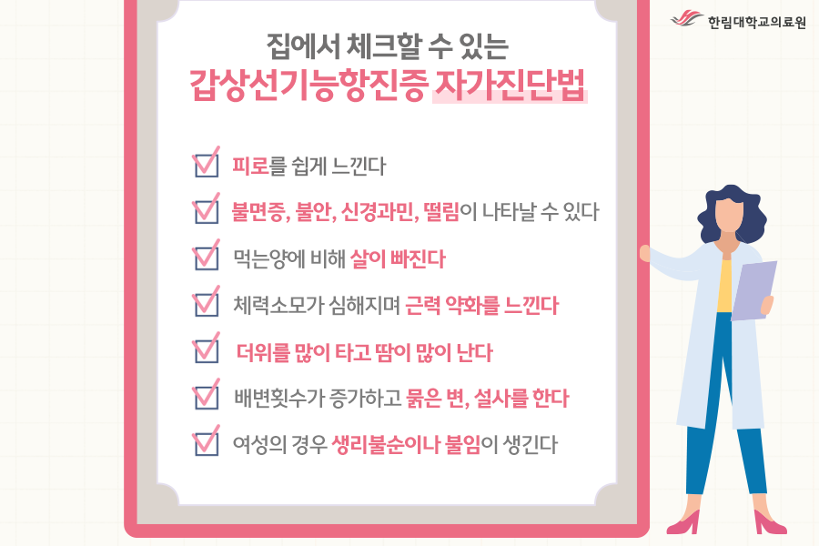 갑상선 기능 항진증의 가장 대표적인 증상으로는 대사가 활발해져 더위에 민감해지고 땀이 많이 나게 됩니다.또한 식욕은 좋고 잘 먹음에도 불구하고 체중이 계속 줄어드는 경우가 흔한 증상이지만 간혹 식욕이 너무 올라 식사량이 크게 늘어나는 경우에는 체중이 오히려 늘어날 수도 있습니다.집중력이 저하되어 안절부절못하거나 불안감을 느끼거나 신경이 예민해져 감정조절이 잘 되지 않거나 가벼운 운동에도 맥박이 빨라져 피로감을 느끼기도 합니다.