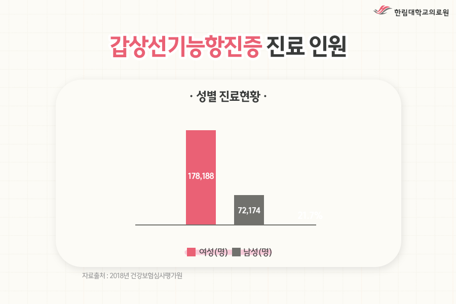 건강보험심사평가원 통계자료에 따르면 2018년 기준 갑상선기능항진증으로 진료받은 인원이 25만362명이며 그중 여성은 17만8188명으로 남성보다 2.5배 높은 진료수를 기록했습니다.