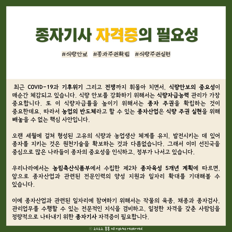 또한 향후 블루오션인 종자산업에 참여하기 위해 이와 관련된 전문자격증을 갖춘 사람임을 인정받기 위해서는 필요한 자격증이라고 할 수 있습니다.