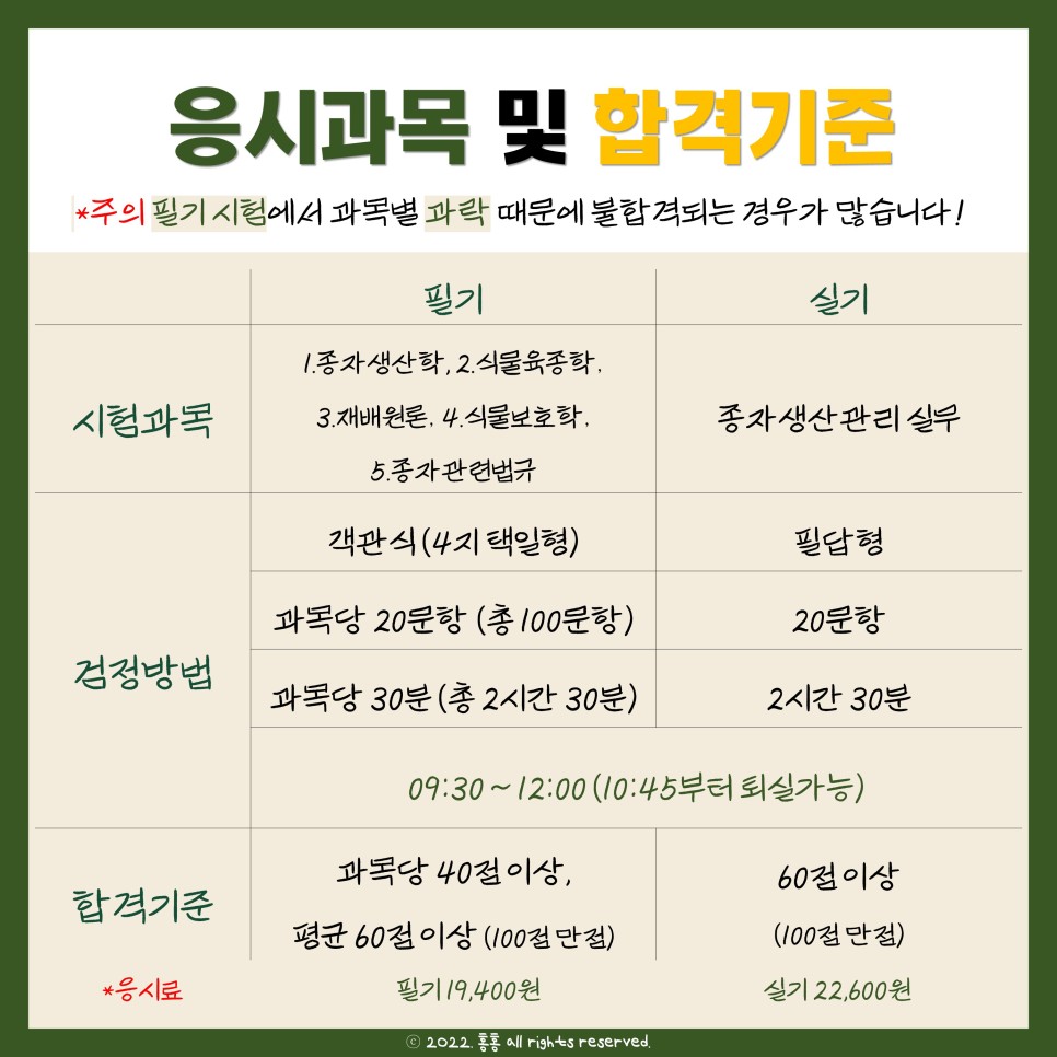 전공자라면 종자생산학, 식물육종학, 재배원론의 경우 쉽게 공부할 수 있을 것 같습니다.그리고 종자 관련 법규의 경우 거의 생소하겠지만 기출문제의 의존도가 큰 편이기 때문에 걱정할 필요는 없습니다.~ 단 식물보호학의 경우 가장 난이도가 높은 편으로 기출의존도가 낮으므로 과락하지 않도록 주의하셔야 합니다!