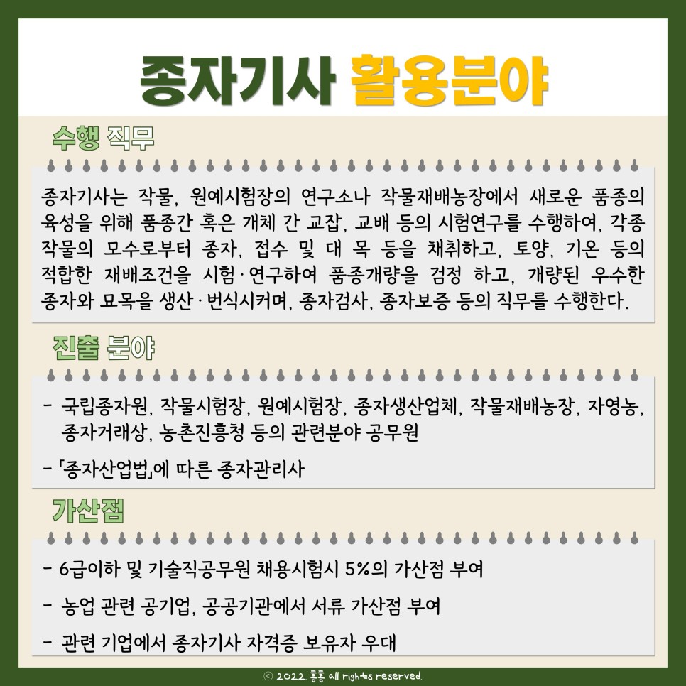 종자기사 자격증만 소지하고 있다고 취업할 수 있다! 라고 할 수 없으며, 공무원 채용시험 또는 공기업 및 사기업의 서류심사에서 가산점을 받을 수 있습니다.