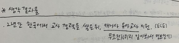 + 추가로 캐나다 ECE에 간다면 캐나다 유치원/어린이집은 한국 유치원보다 업무 강도가 낮은 편이다.