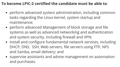 다음으로 난이도의 Advanced Ministration과 Linux Optimization에서는 리눅스 커널과 시스템 시작 유지보수를 비롯해 방화벽과 VPN을 포함한 고급 네트워킹과 블록 스토리지, 파일 시스템 고급 관리, DNS와 FTP, NFS, 웹 서버 등의 각종 서버 등을 공부해야 합니다.