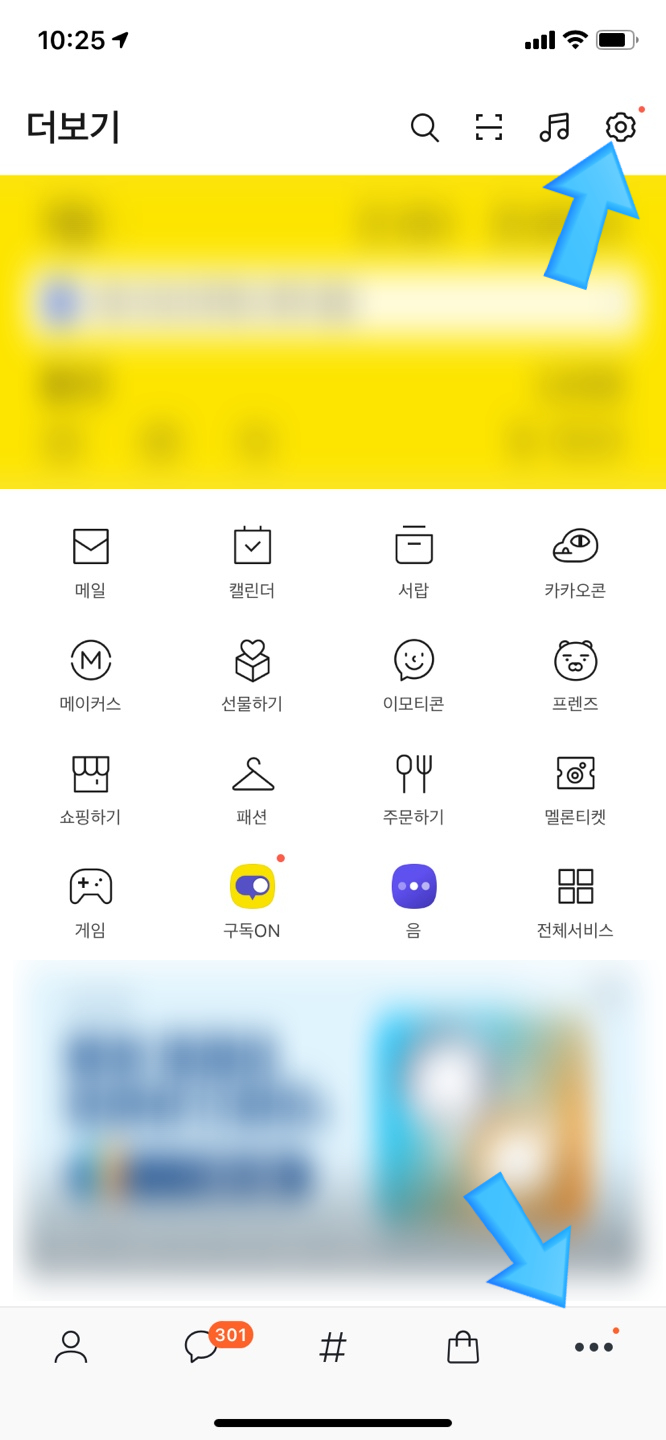 다들 카카오톡 앱 있죠?먼저 카카오톡 앱에 접속한 후 하단에 위치한 점 3개의 아이콘을 클릭합니다.그 다음에는 상단에 있는 톱니바퀴 아이콘을 누르세요.톱니바퀴 아이콘은 설정창입니다!