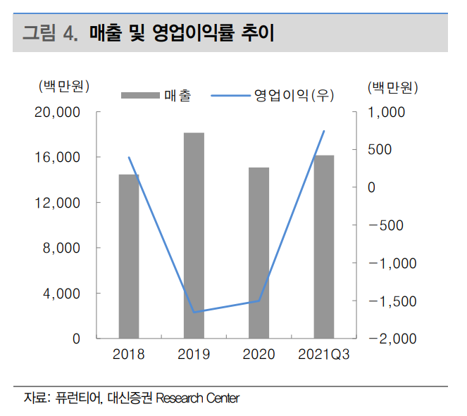 퓨론티어의 매출액은 1819년부터 20년까지 침체되었고, 21년에는 222억원을 기록하며 반등했습니다.