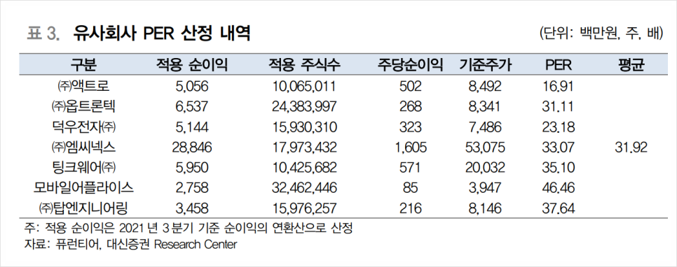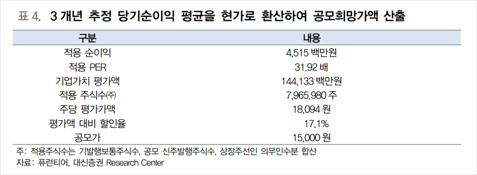 실제로 퓨론티어 공모 가격 산정 당시 유사기업의 PER인 31.92배를 적용하고, 주당 実際 実際ᆫ라는 적정주가를 구하고,