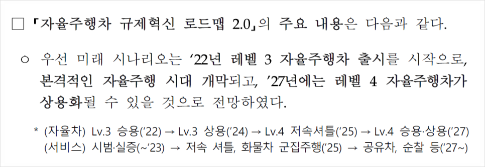 정부도 이에 맞춰 27~30년 장기계획으로 레벨4의 자율주행차 규제 및 제도기반을 구축할 계획입니다.