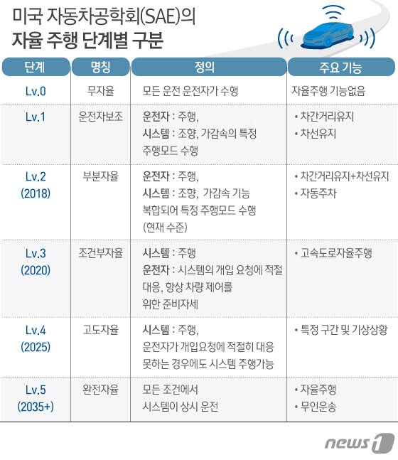 글로벌 자동차 업체들이 자율주행 레벨3를 잇따라 발표하고 있는 가운데 미국자동차공학회에서는 자율주행 기술을 0단계에서 5단계로 총 6단계로 구분하고 있으며, 이는 현재 국제적으로 통용돼 사용하고 있습니다.2030년도 자율주행 시장 규모는 매년 49.8%씩 성장할 것으로 예상하고 있습니다.