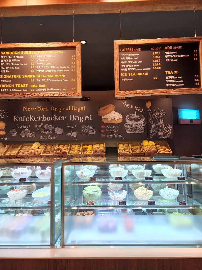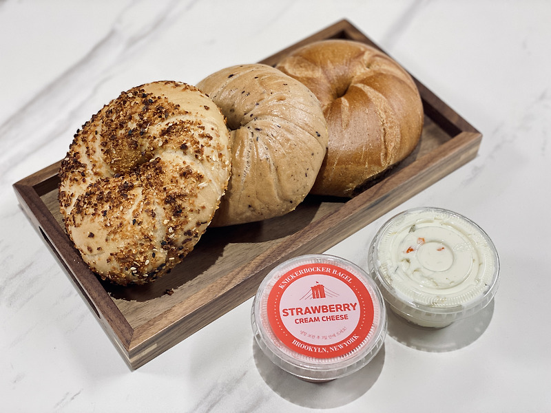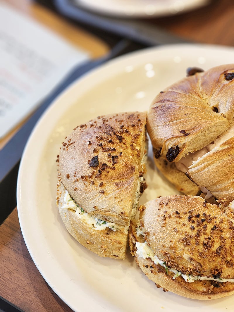 다양한 베이글과 크림치즈가 눈에 띄네요.