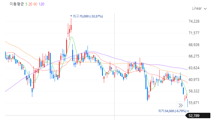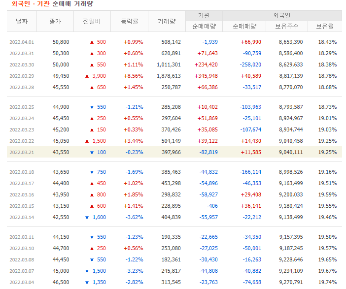 아래를 보시면 알 수 있습니다만, 외국인의 보유율도 감소 경향에 있었습니다. 다만 최근 2주 동안 10% 이상의 주가 상승을 보여 반등에 대한 기대감을 심어주고 있습니다.