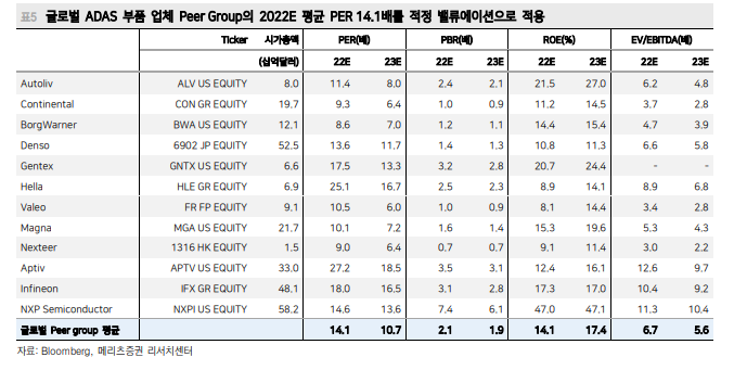 메리츠증권에서는 만도의 주력 상품인 ADAS 부품 메이커의 Peer 그룹내의 밸류에이션을 적용하여 만도의 목표주가를 일시적으로 하였습니다.