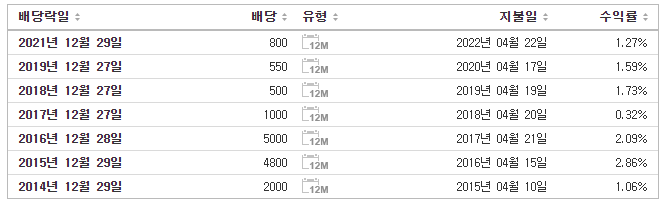 올해도 만약 배당을 실시할 경우, 연말 12월 29일경의 배당락일을 거쳐 2023년 4월 배당금 지급이 예상됩니다. 배당금을 수령하고자 하는 경우에는 배당기준일 전일까지 매수하여야 합니다.