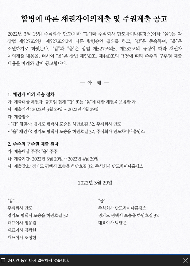 만도의 중국 법인의 지주회사인 만도차이나 홀딩스는 5월 1일에 만도에 합병되어 경영 효율성과 사업 역량의 강화에 대한 의지를 나타내고 있습니다.