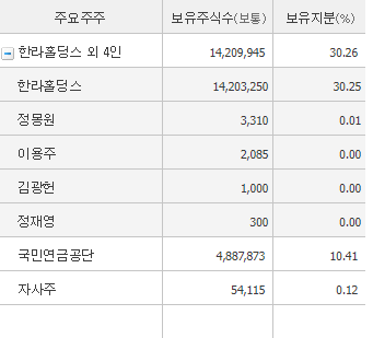 대주주는 한라그룹의 대들보인 만큼 한라홀딩스입니다. 국민연금공단의 10% 정도의 물량이 있으며 외국인 지분율은 18.53% 수준입니다.