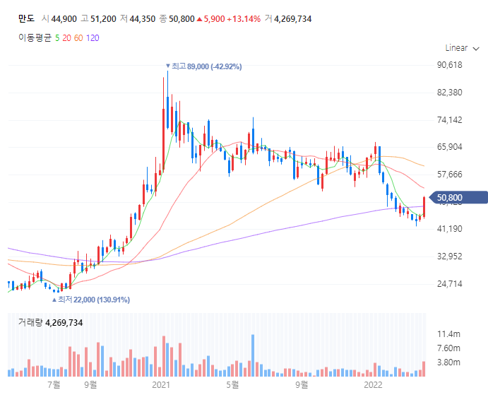 만도라는 회사를 자율주행 관련주로 판단하여 높아진 주가는 단번에 매력도를 잃어, 자율주행부문의 100% 물적분할이 이루어지게 되었고, 9월 1일부로 자동차 부품회사 만도는 더 이상 직접적인 자율주행 관련주가 아니게 되었습니다.