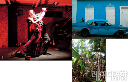 1 부에노스아이레스 라보카 항구의 탱고.2 쿠바의 클래식카. 3 아마존 정글 김영희 PD는 단기간에 11개국 30개 도시를 돌았다. 비행기를 탄 횟수만 29회다. 거의 매일 짐을 꾸렸다고 생각하면 될 것이다. 그래도 덕분에 남미에 있는 나라 대부분을 순회했다. 아르헨티나 베네수엘라 쿠바 칠레 브라질 콜롬비아 볼리비아 에콰도르 페루 등 쉴 틈 없이 이동하며 입국이 허용되는 남미 구석구석에 일일이 도장을 찍었다.