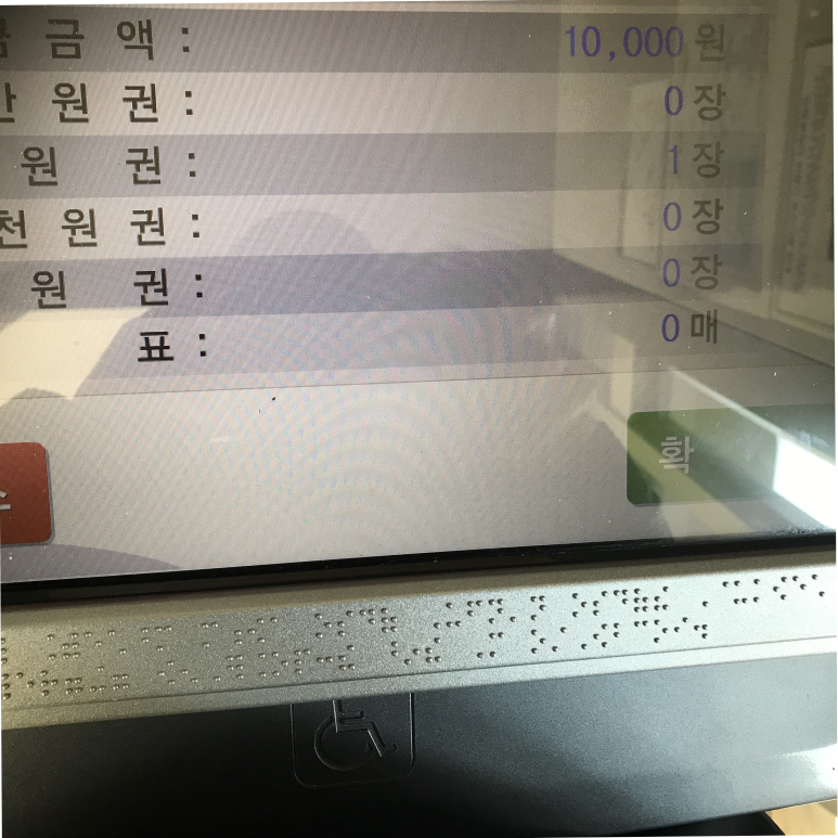 그러면 ATM 우측 상단에 돈을 넣는 케이스가 열립니다.저 상자 안에 입금하고 싶은 금액(현금)을 잘 요약해서 넣어주시고 확인 버튼을 터치합니다.