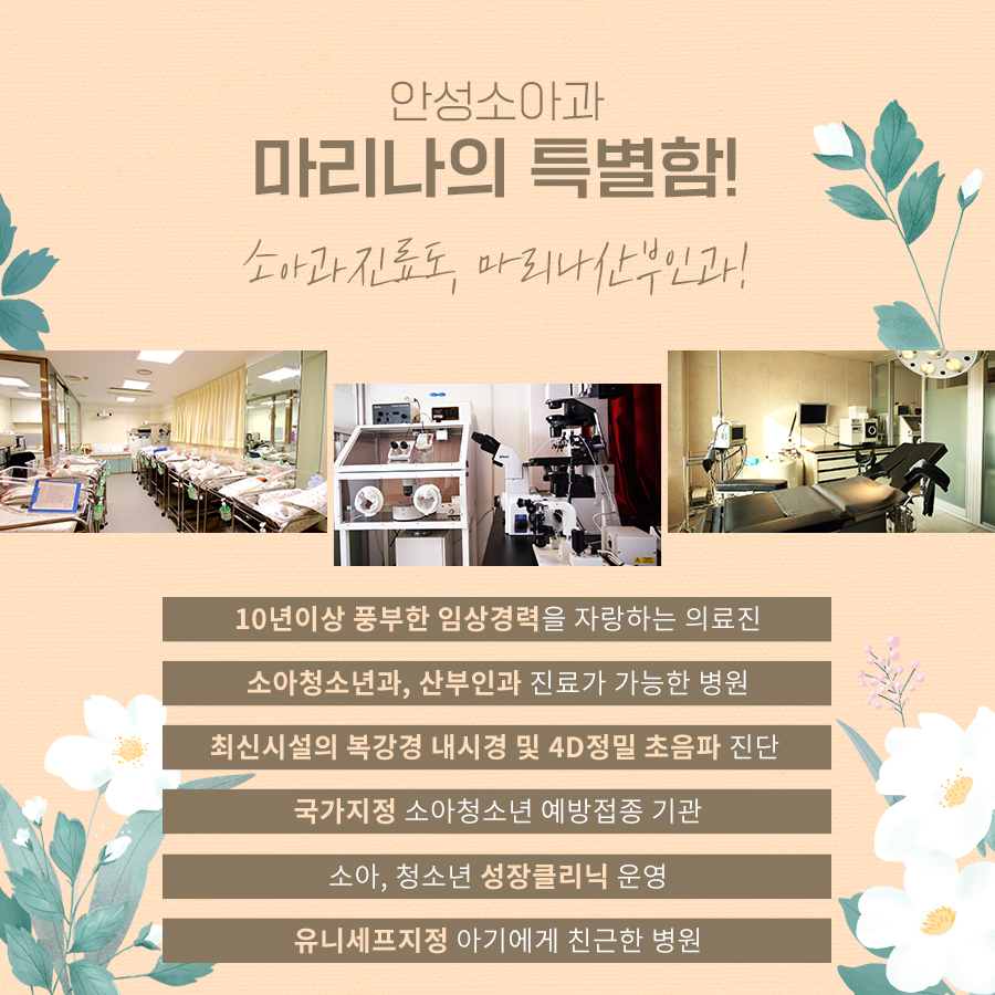 마리나에서는 소아과뿐만 아니라 내과, 마취과, 산부인과 전문의가 상주하고 있어 응급상황에 맞는 적절한 대처가 가능하며 다른 과목의 진료도 함께 볼 수 있어 편리한 의료서비스를 받을 수 있습니다.편도선염과 같은 기관지 질환에서 다양한 질환과 영유아 검진 등의 진료도 보실 수 있으니 확인하시고 이상이 있을 경우 안성소아과 마리나로 내원하여 적절한 처방을 받으시기 바랍니다.