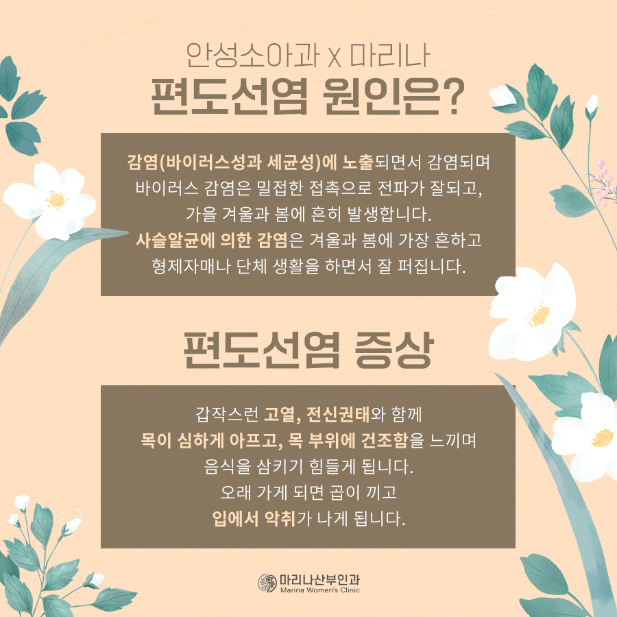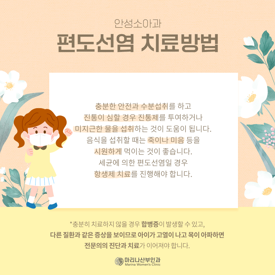 편도선염은 소아에게는 감기만큼 흔한 질환으로 적절한 때에 치료하면 대개 1주일 이내에 완치되지만 방치하면 편도선 부위와 전체적으로 염증이 퍼져 목 주위에 고름이 쌓일 수 있으며 기관지염, 포만염, 비염, 부비통 등을 일으켜 회복하는데 더욱 어려워질 수 있습니다.