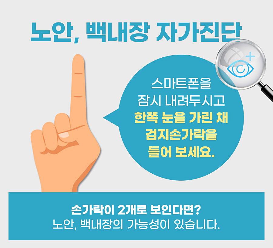 백내장이나 노안 자가진단 방법이 있었어요 손가락을 눈앞에 들어 한쪽 눈을 가린 뒤 손가락을 보게 된 경우 손가락이 어떻게 보이느냐에 따라 노안과 백내장을 진단할 수 있었습니다. 이렇게 한쪽 눈을 가리고 손가락을 보았을 때 손가락이 두 개로 보일 경우 백내장이나 노안의 가능성이 있기 때문에 반드시 안과를 찾아 정밀 검사를 받아야 했습니다.