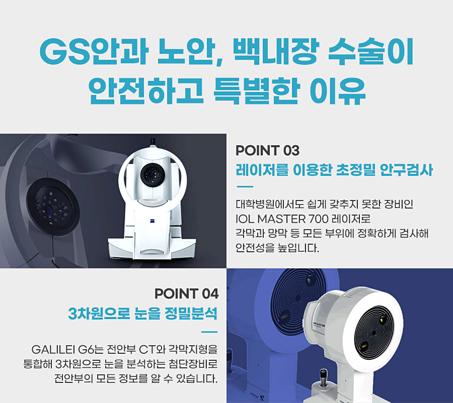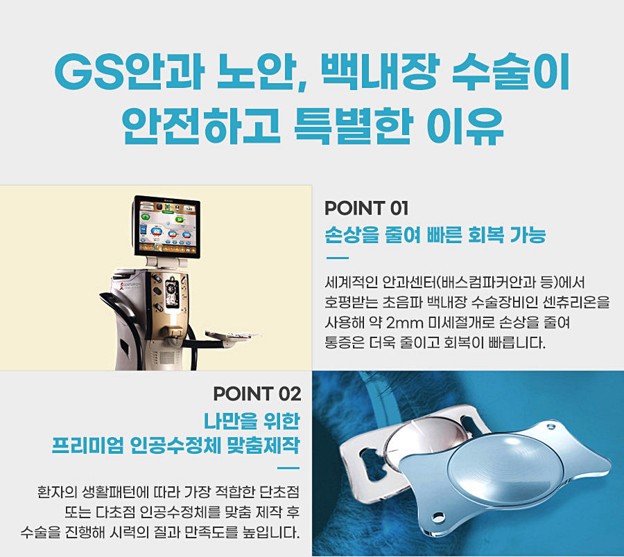 초음파 백내장 장비인 센츄리온이라는 기기를 이용하여 안구의 손상을 줄이고 일상생활의 복귀가 신속하게 이루어지게 되었습니다. 또한 인공수정체를 맞춤 사용하여 개개인의 생활패턴에 매우 적합한 초점 인공수정체를 이용하여 시력의 질을 높이고 만족도를 높일 수 있었습니다.