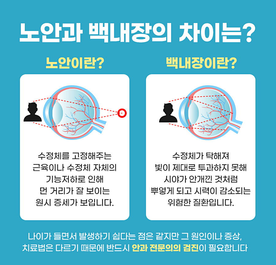 노화로 인해 생기는 백내장과 노안은 다른 이름으로 분류되는 만큼 원인과 증상이 다르게 나타났습니다. 노안은 수정체를 유지하고 있는 근육이 약해지거나 수정체 자체의 기능이 저하되는 것을 원인으로, 원거리에 잘 보이는 원시 증상을 보이게 되어, 백내장의 경우 수정체가 탁해지는 것이 원인이었습니다. 수정체가 탁해지고 빛이 충분히 투과하지 못해 시야가 흐릿해지는 현상이 계속되면서 시력이 저하되기 때문에 매우 위험한 질환으로 분류됐습니다.