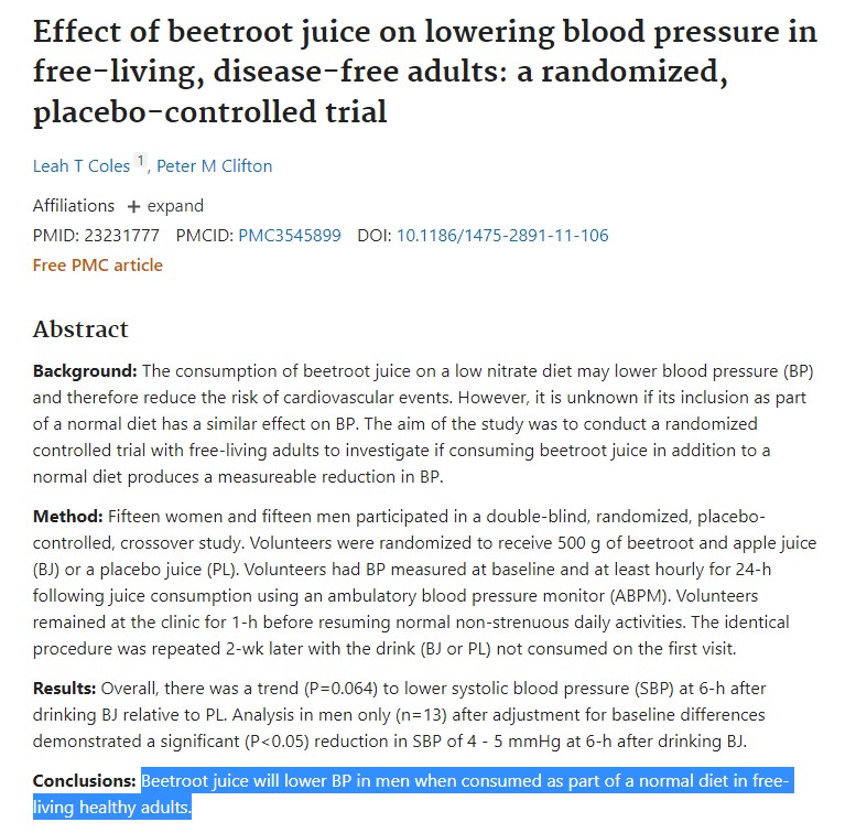이 논문 외에도 비트 주스가 심장 건강과 혈압 강하에 효과가 있다는 논문을 다수 볼 수 있었다