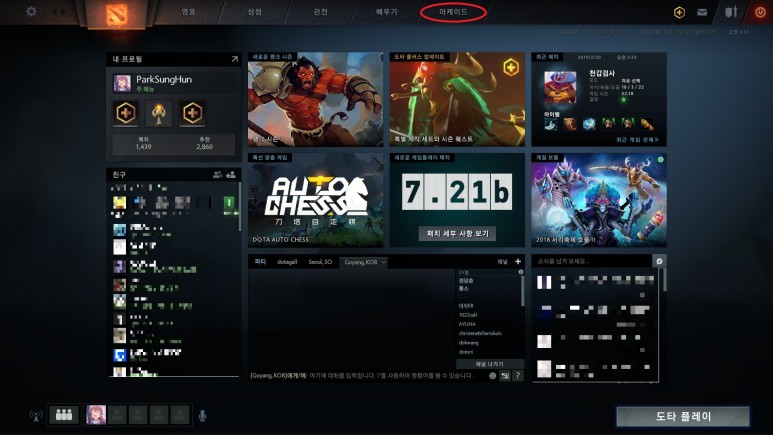 4. 도타2 메뉴 창에서 오른쪽 상단에 아케이드를 누릅니다.도타체스는 도타2의 아케이드 게임입니다.